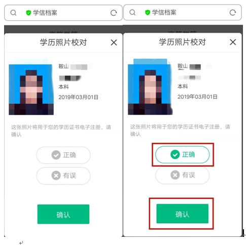 6、如無誤,請在學(xué)歷照片處點擊確認(rèn),然后告知自己的班主任,已完成圖像校對。如有誤,請第一時間聯(lián)系自己的班主任。